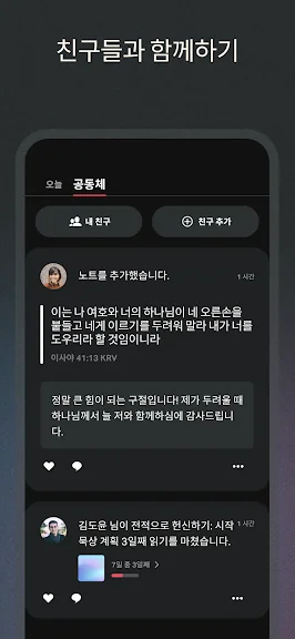 성경 앱으로 가장 가까운 친구들과 함께 성경을 탐구할 수 있습니다. 본인이 믿고 신뢰하는 공동체 식구들과 말씀에 대해 솔직한 대화를 나눠 보세요. 그들이 탐구한 내용을 보며 함께 말씀을 배우세요.